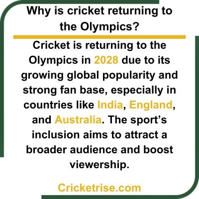 Cricket is a very popular sport with billions of fans in countries like India, Pakistan, Australia, England, and many others. If cricket becomes part of the Olympics, it will attract a huge number of viewers from all around the world. The short and exciting T20 format fits well with the Olympic schedule and is easy for new viewers to understand.